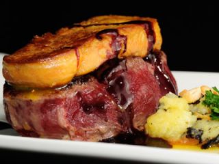 Servimos los solomillos con el foie y la salsa por encima. Acompañamos con un puré de patata natural con trufa picada y unas almendras.